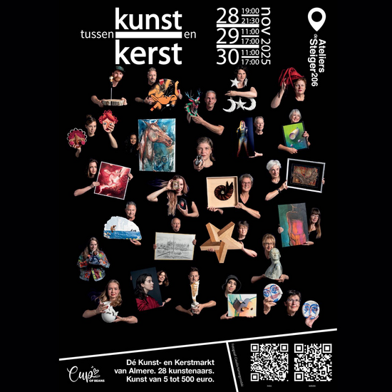 Between Art and Christmas ('Tussen Kunst & Kerst') is organized by all participating artists housed in Ateliers de Steiger 206, along with carefully selected guest artists. We have a unique concept featuring so many talented artists under one roof and a diverse range of disciplines.