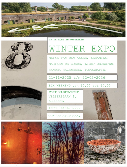 Winterexpositie , Keramiek, fotografie, en lichtobjecten. Een groter verschil in disciplines is bijna niet mogelijk en ook de kunstenaars zelf lijken in weinig op elkaar. Toch ontstaat er een nieuw beeld van drie eenheid. Meike van den Akker: keramiek Mariken de Goede: licht objecten Sandra Hazenberg: fotografie Horeca aanwezig.