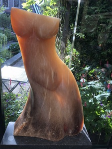 Expositie van 40-45 stenen beelden, gehakt door Corrie Kaas In een tuin met bloeiende planten en enkele oeroude fruitbomen, aan het water van 'Het Rijk der Duizend Eilanden