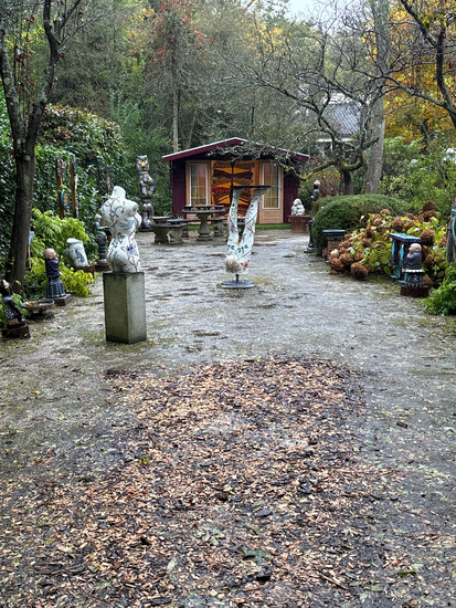 Mozaïek beelden in de tuin. Waaronder boeddhabeelden, fontein, vlinders, schalen, totempaal. Binnen diverse torso’s