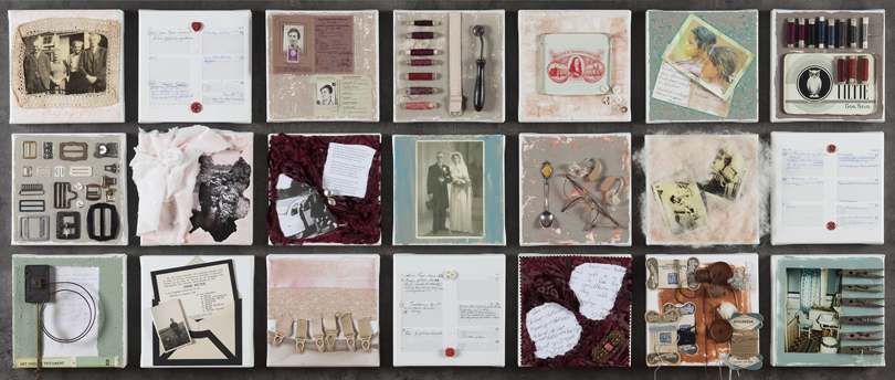 Met welk werk van de afgelopen twee jaar ben je het meest in je nopjes?Dat is ongetwijfeld 'In loving memory'. Het is een eerbetoon aan mijn moeder die in 2010 overleed. Het werk grijpt ook terug op mijn vader die in 1985 is overleden. Het is een monument voor de oudere generatie van de vorige eeuw en herkenbaar voor veel van mijn leeftijdgenoten. Jarretels, oude knopen en postzegels, oude foto’s en identiteitskaarten verhalen van een andere tijd.