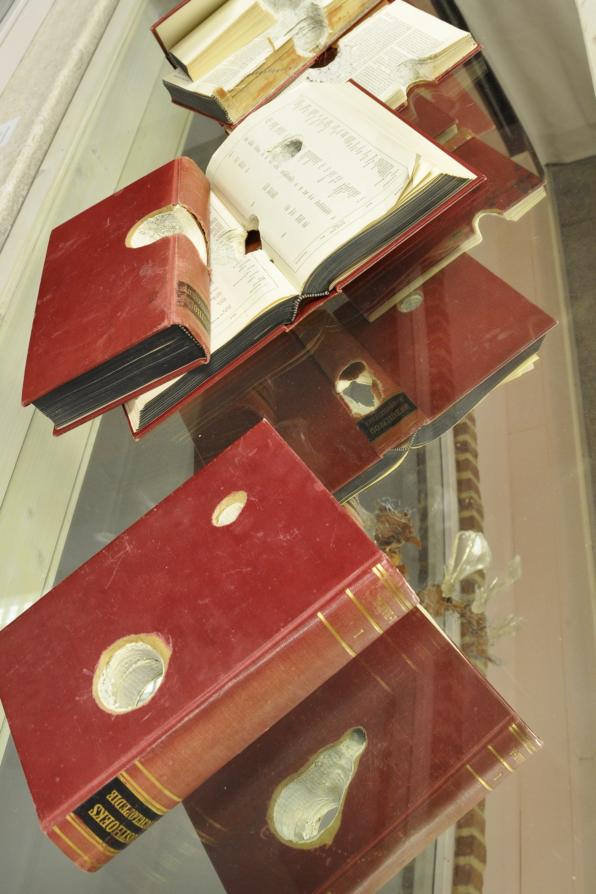 Toen ik de boeken voor de eerste keer op de tafel wilde plaatsen, viel een boek per ongeluk open bij Hitler. Ik wist niet dat de boor een enorm gat in zijn hoofd had gemaakt. Mijn vader heeft in de oorlog in het concentratiekamp Buchenwald gezeten. Dit maakt het werk voor mij nog belangrijker.