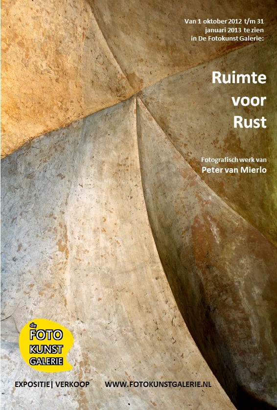 Van 1 oktober 2012 t/m 31 januari 2013 exposeert De Fotokunst Galerie het werk van Peter van Mierlo. De expositie ‘Ruimte voor Rust’ kenmerkt zich door het indrukwekkende lijnenspel in de foto’s en abstracte composities.