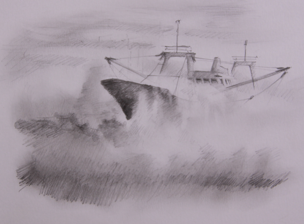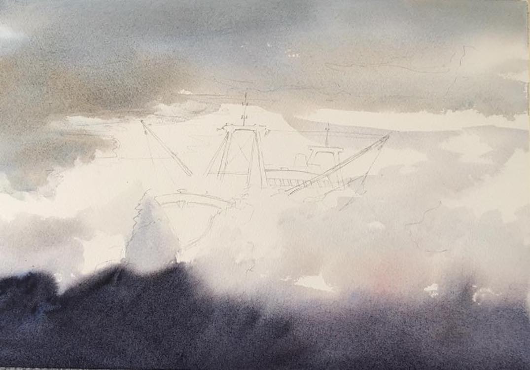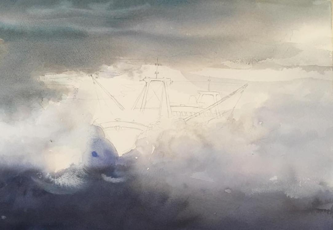 In onderstaande fotoserie is de totstandkoming van van de aquarel 'Fishing in rough sea' te zien.