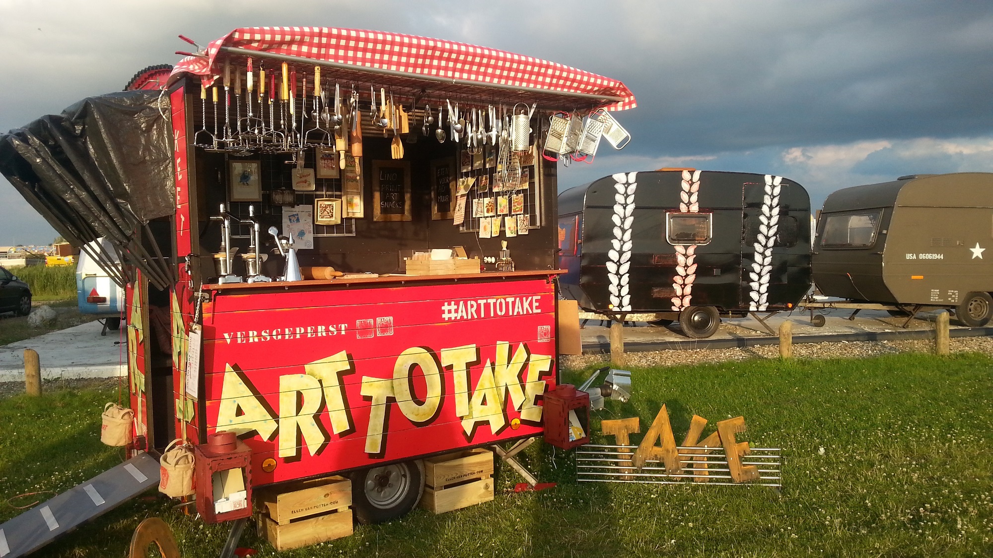 De Art To Take is uit haar rollende assen verrezen! De reizende kunstkeuken, met als thuisbasis Beverwijk (NH), wordt een echte blikvanger op uw evenement. Waarom? Omdat de Art To Take het bindmiddel is tussen kunst en culinair, uniek is in Nederland en ver daarbuiten. Deze reizende linoleumdrukkerij is een koppeling tussen grensverleggend kunstobject, rollende kunstkeuken en mobiel atelier. In het spoor van de hippe Food Trucks komt Art To Take het oog strelen in plaats van de tong.