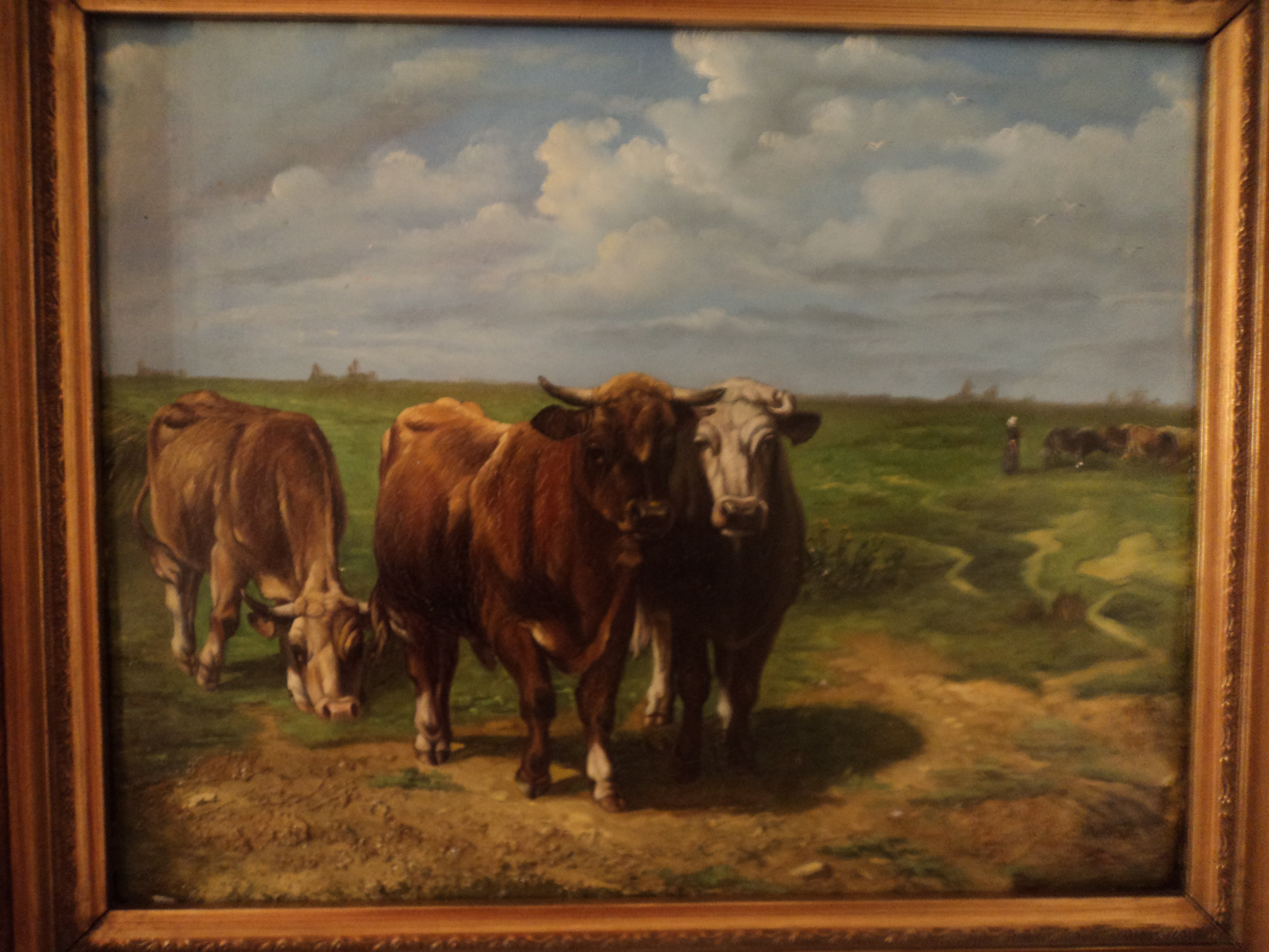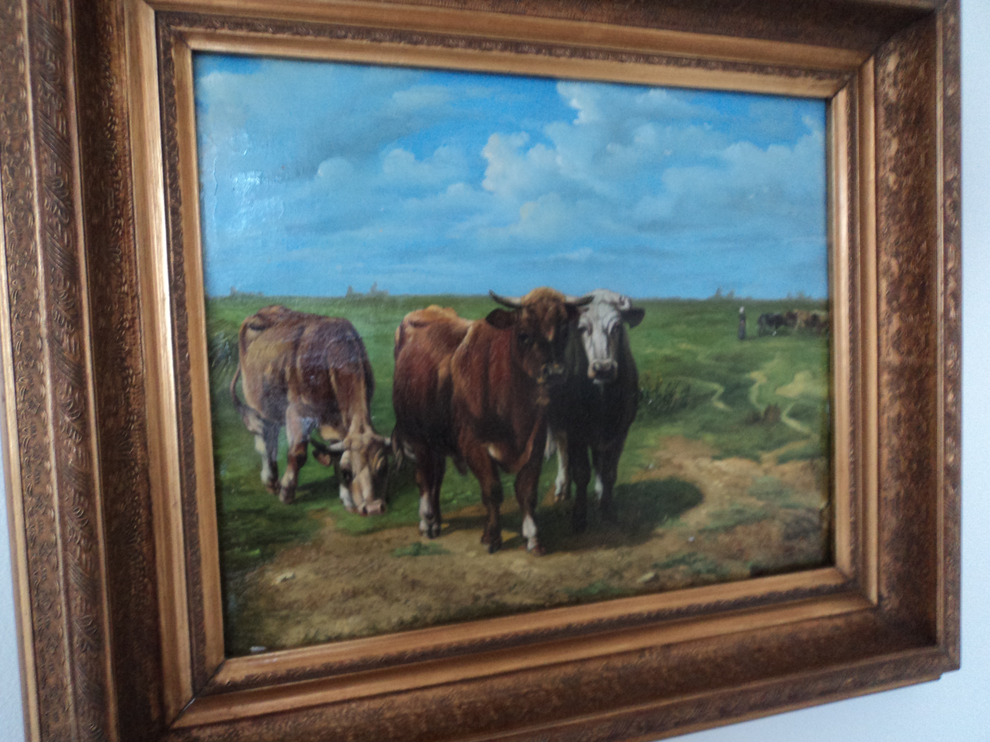 Zo ziet het er wat beter uit, maar de foto is voor mij onvoldoende scherp om relevante details in de schildering te bekijken. De schilderstijl gebruikt een tamelijk antieke manier van weergeven van runderen. Zoals we een beetje kennen van Paulus Potter. Maar ik schat dat het werk is gemaakt omstreeks 1890-1920. Het is hoogstwaarschijnlijk een Hollands ( of Vlaams ) landschap. Er is een koeienhoedster aanwezig en haar kleding...(hier gaat het voor mij dus mis wegens onscherpe details) zou misschien wat meer kunnen vertellen over de tijd waarin het is gemaakt. Technisch zijn de koeien redelijk tot goed weergegegeven. Dat wijst op enige kennis van anatomie en technische achtergrond. Ook de struktuur van de vachten is goed. De bruine (tweede van links met brede hoorns) is overigens een jong stiertje. Het landschap is verder heel pover met weinig interessante details en oogt een beetje romantisch van opzet. Het werk heeft geen sterke compositie (vind ik). Ik kan er helaas geen naam van een mogelijke schilder op plakken.