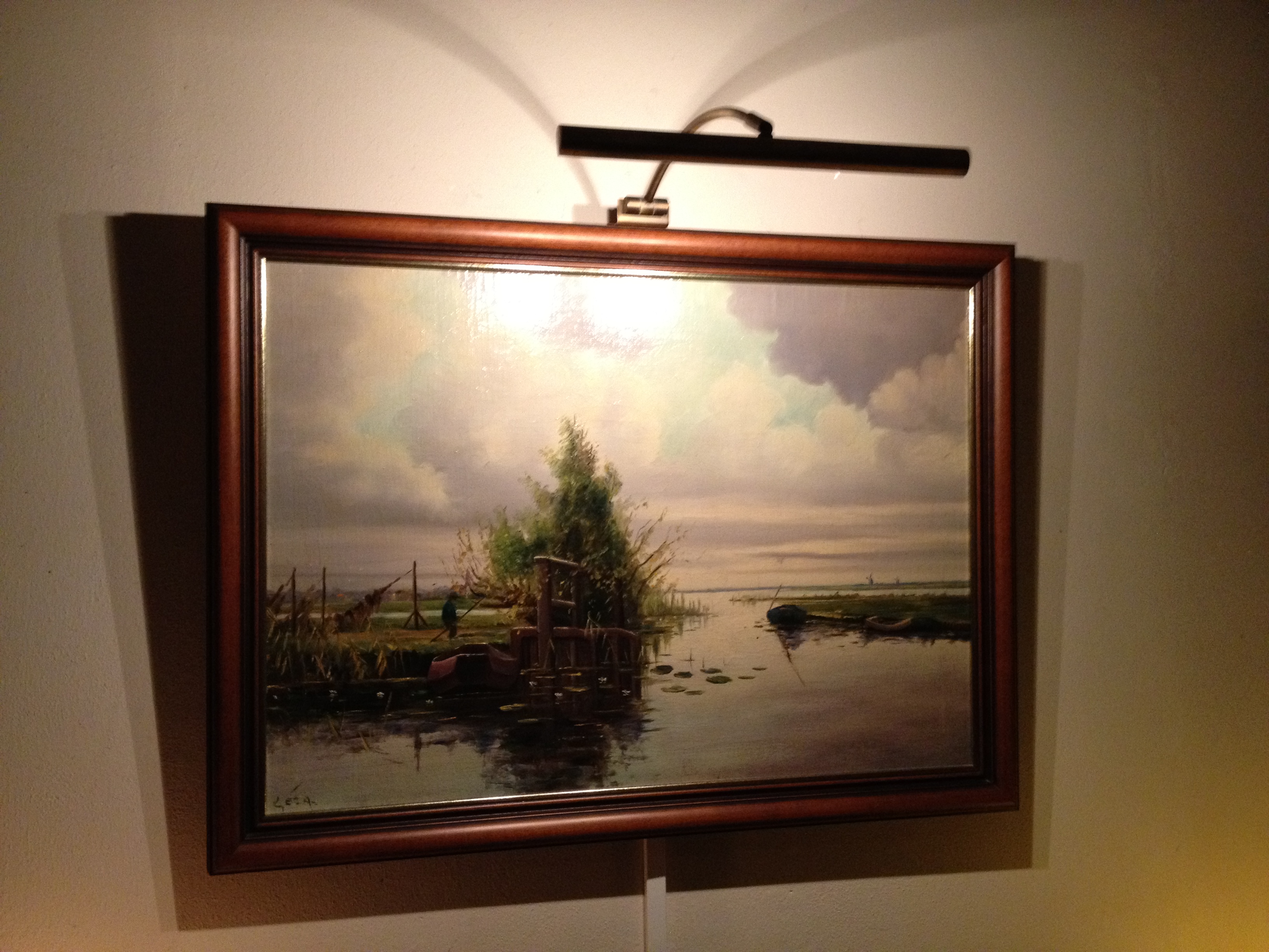 Het moet in de buurt van Kortenhoef zijn. Het mannetje en stijger doen denken aan Paul Gabriel. Water, begroeiing en lucht lijkt op Willem Roelofs. Doch het werk is veel te oppervlakkig en te gelikt om van hun hand te zijn. Dat geldt overigens ook in vergelijking met het werk van Arie Zwart en Dirk Smoorenberg. Cor Bouter of Jan Knikker jr zou m.i. nog wel kunnen.