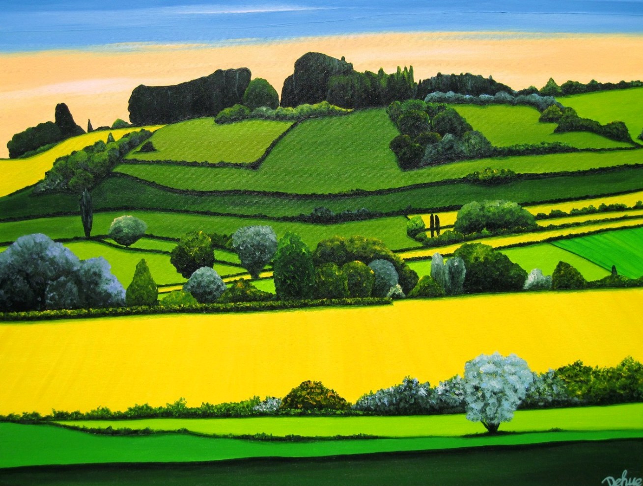 Figuratief Geel Landschap Blauw Yellow Groen Frankrijk Realistisch Natuur Bomen Green De Landscape Lente Frans Voorjaar Fields Heuvels Struiken Nature Paysage D'auvergne Colza Spring Koolzaad