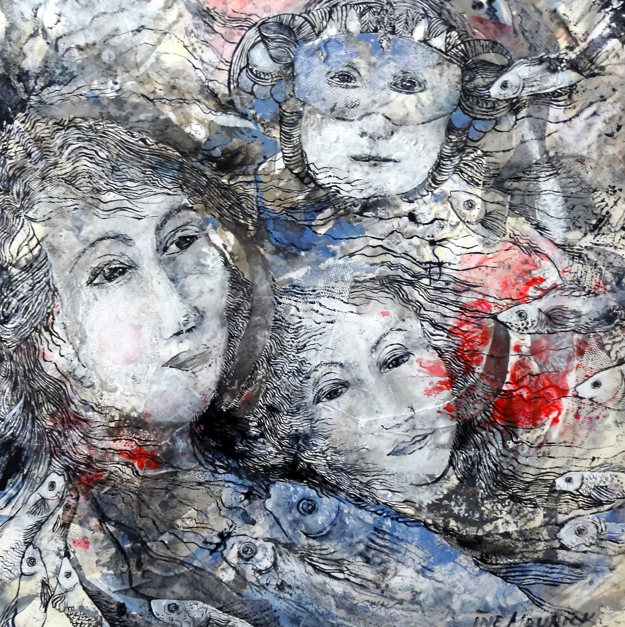 Mijn inspiratie: mijn liefde voor de zee en water Techniek: gemengde techniek op cardboard, waarbij kleine stukjes stof in de acrylverf zijn verwerkt Formaat afbeelding: 33x33 cm, omlijst met een passe- partout van 9 cm breed Incl. zilverkleurige houten lijst