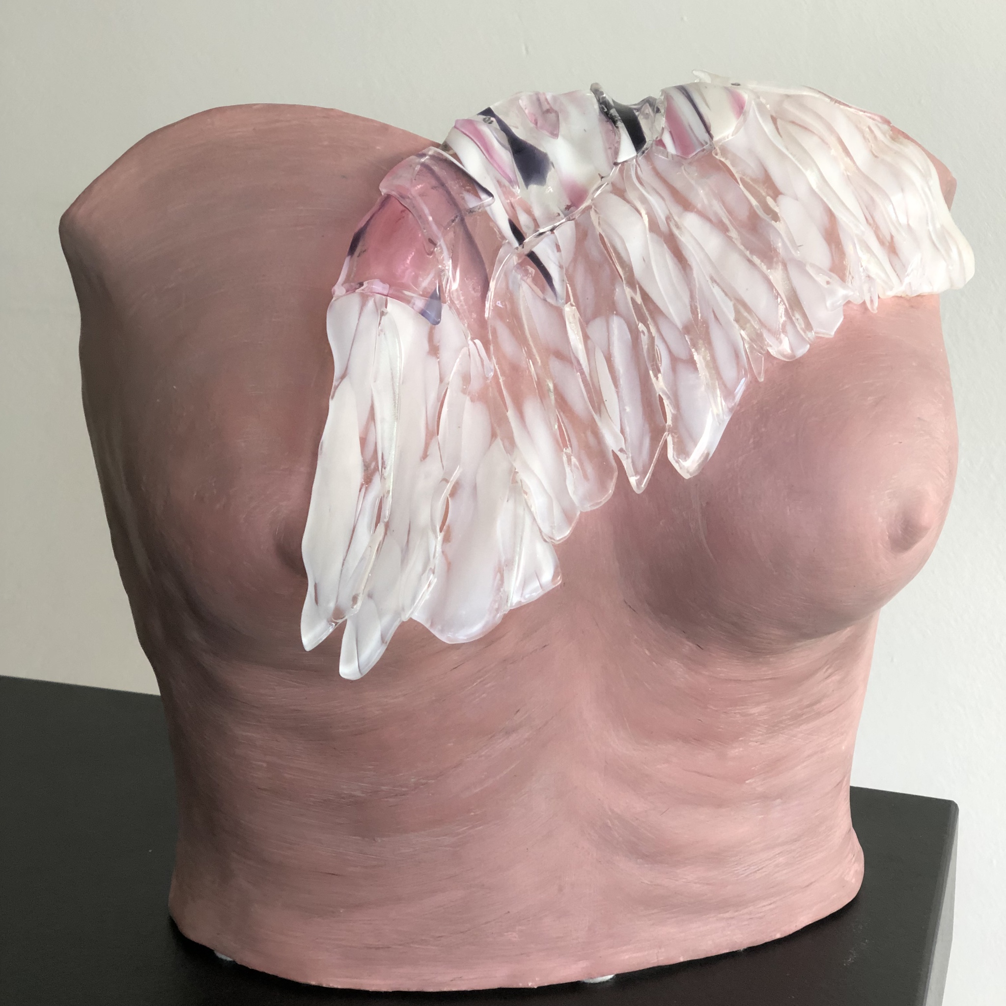 Moeder met de breekbare glazen vleugel van haar beschermengel op haar schouder en over haar hart.