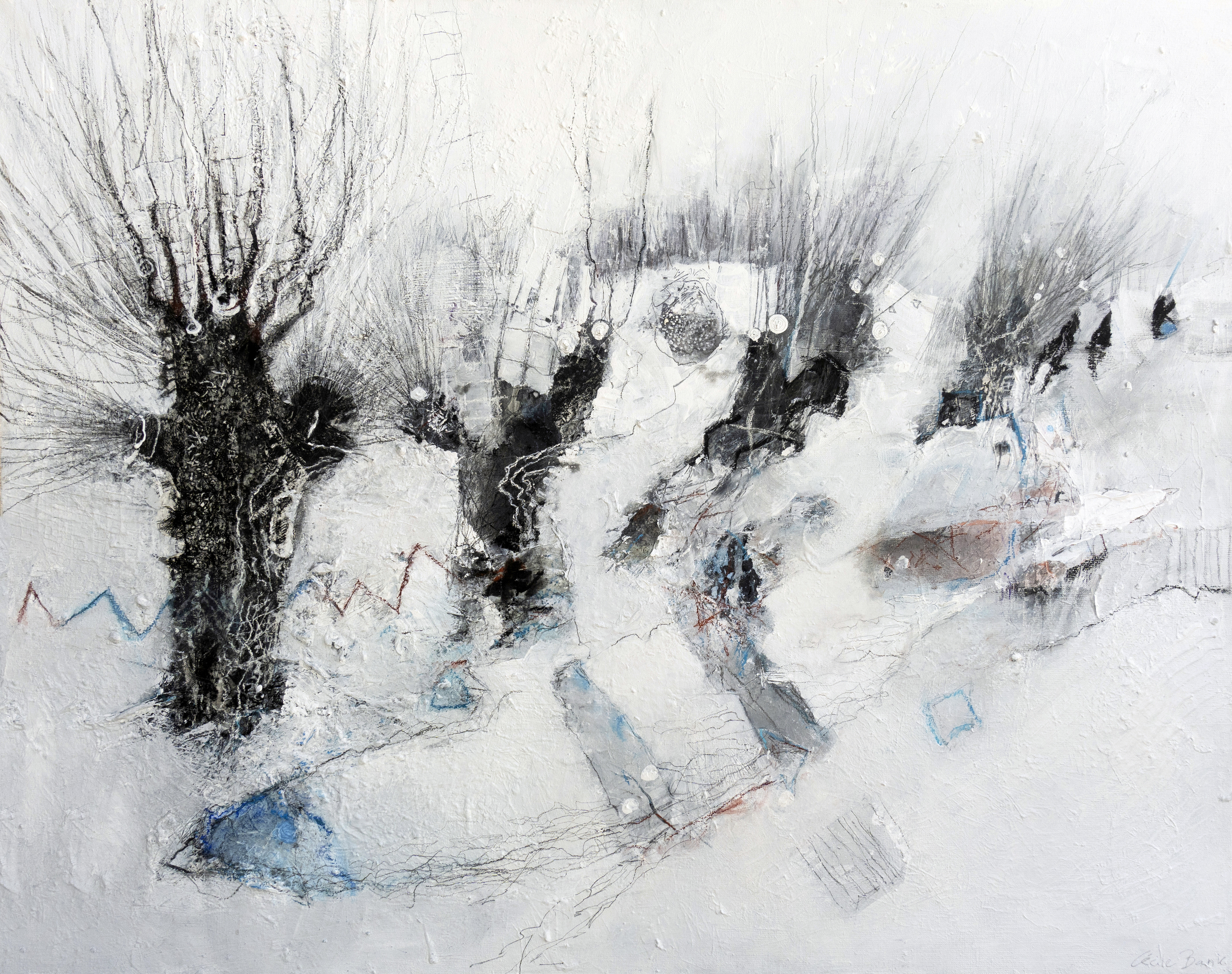 Schilderij Wit Zwart Landschap Mixed Media Gemengde Techniek Tekening Natuur Painting Bomen Winter Black White Landscape Drawing Tree Nature Knotwilgen