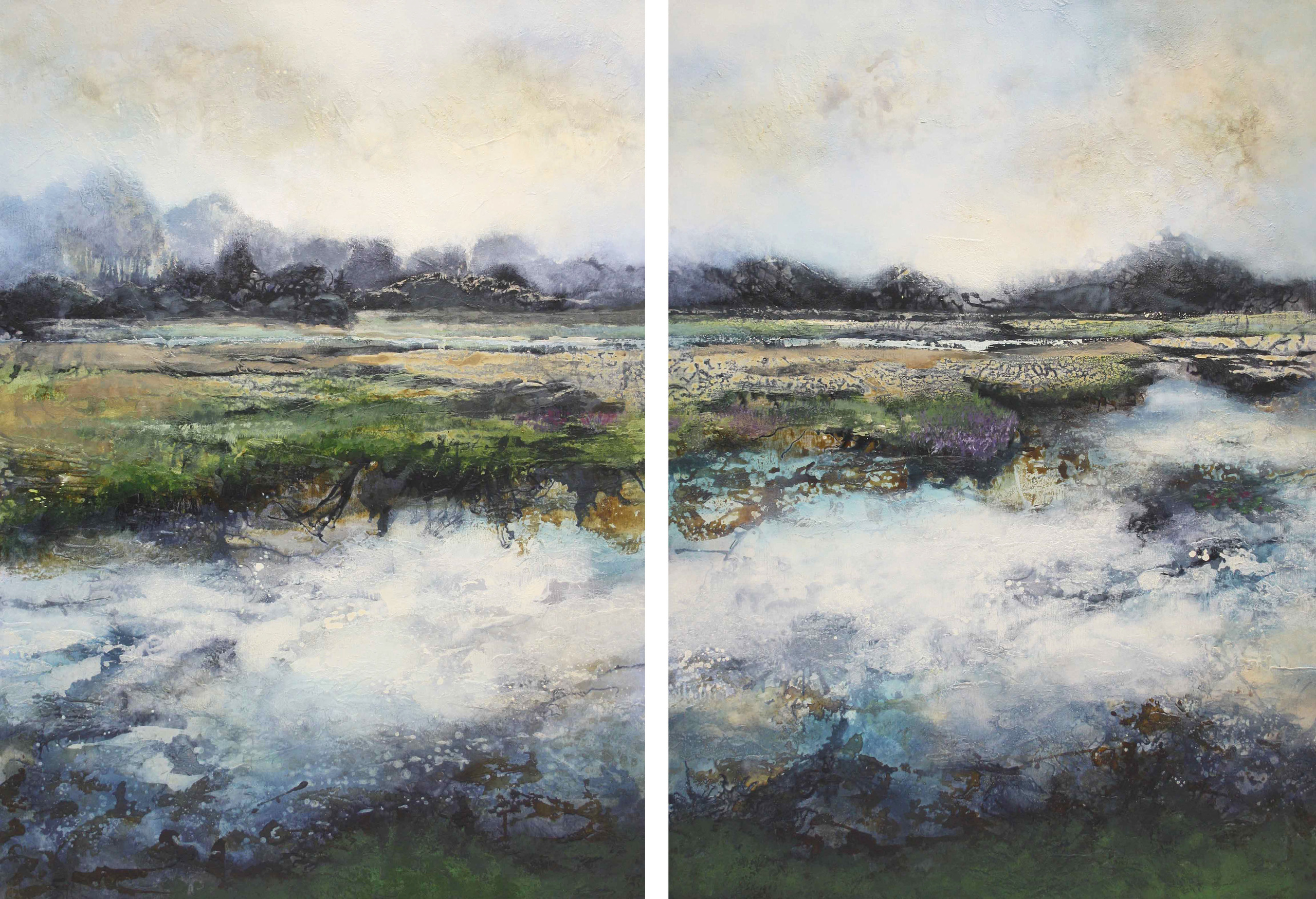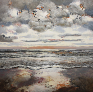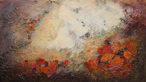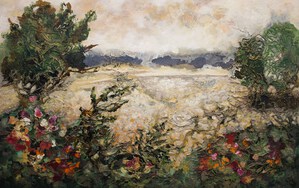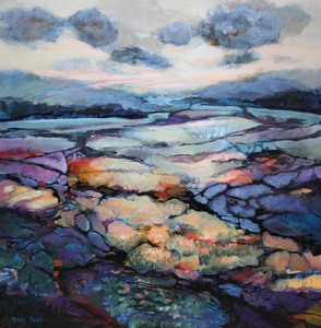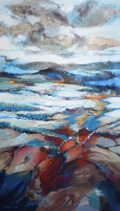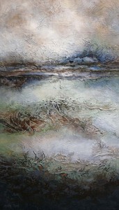 Marly Freij maakt grote kleurrijke, maar ook meer ingetogen schilderijen in gemengde techniek, met name sferische landschappen en abstracte composities
