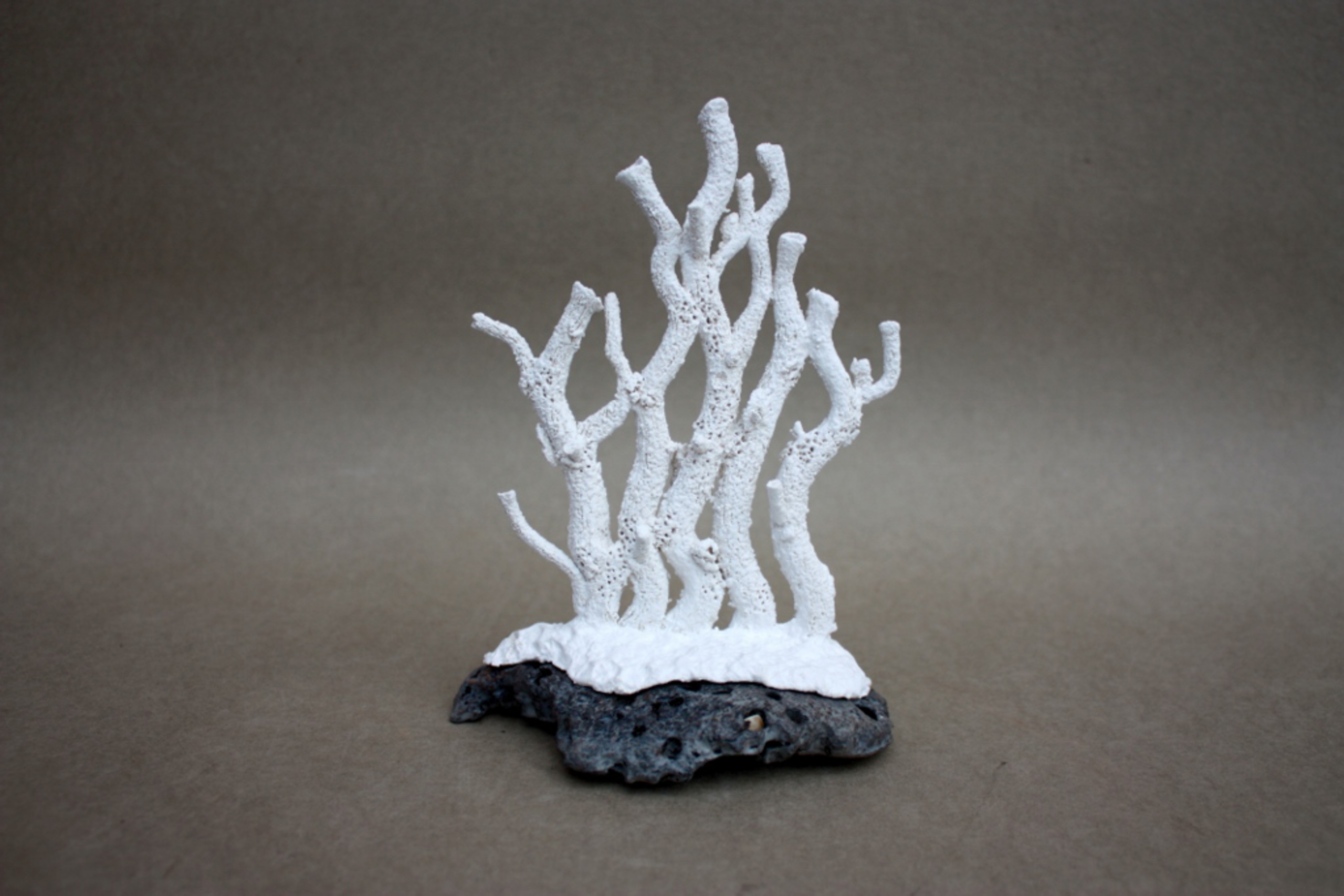 Techniek: Steengoed met porselein-structuur-huid gestookt op 1220 graden C. Gemonteerd op juthout.
