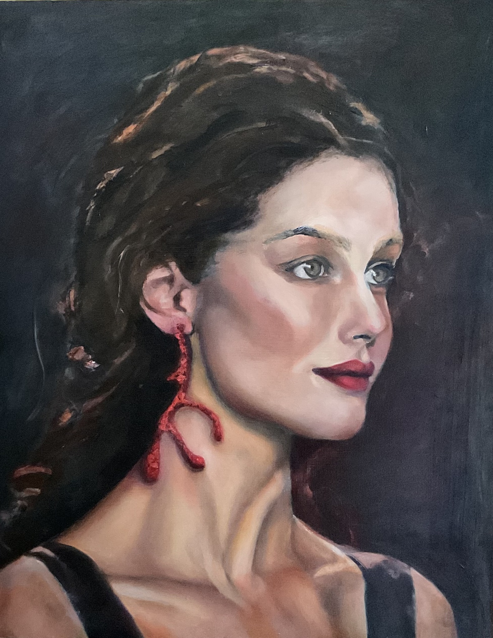 Een klassiek portret met een stille signatuur: Alessia draagt een sieraad, de hele-noot, gevormd uit mijn eigen muzieknoten — een zachte echo van mijn wereld, verweven in de hare. In mijn atelier neem ik soms een stille omweg naar klassieke portretten, steeds versierd met een muzieknoot die mijn wereld draagt.”