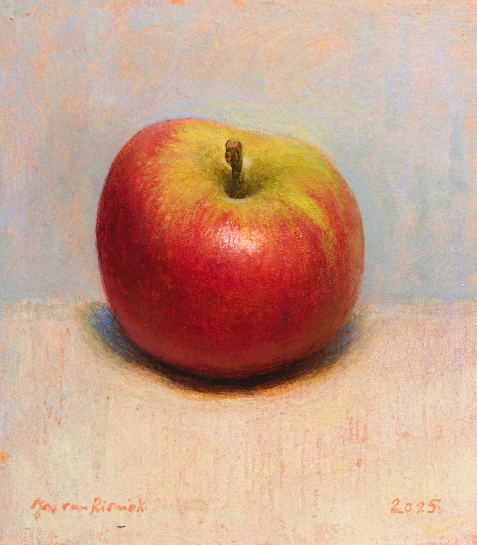 Klein stilleven met rode appel op witte tafel