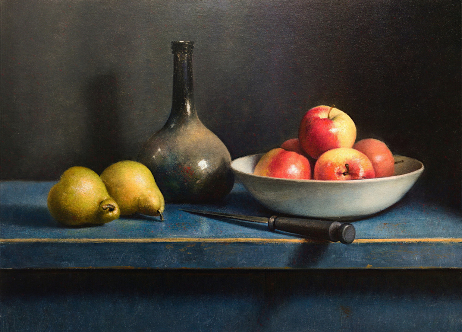 Stilleven met appels, peren en zwarte fles