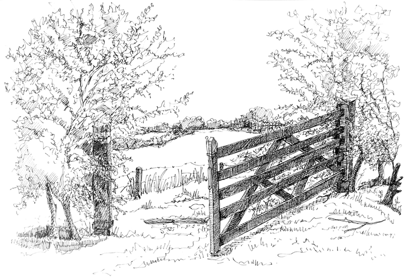 Hutje in de bergen inkt tekening