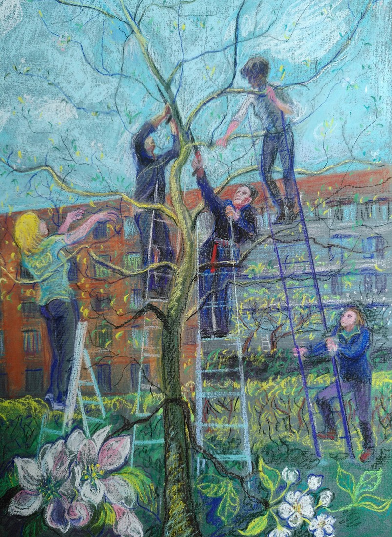 Gerrit geeft leiden aan de bomen snoeiers in de lente op de GWL terrein