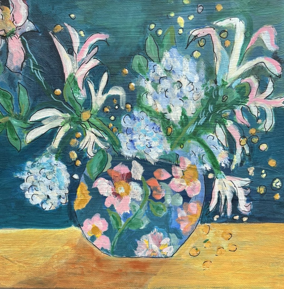 bloemen in blauwe vaas