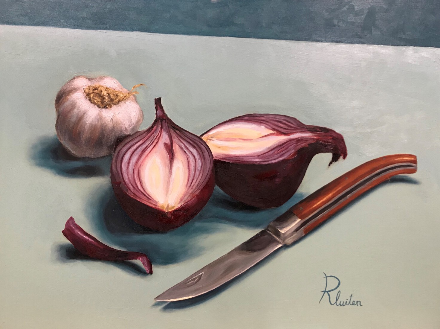 Kruik met rode en witte uien