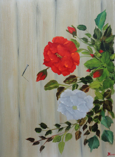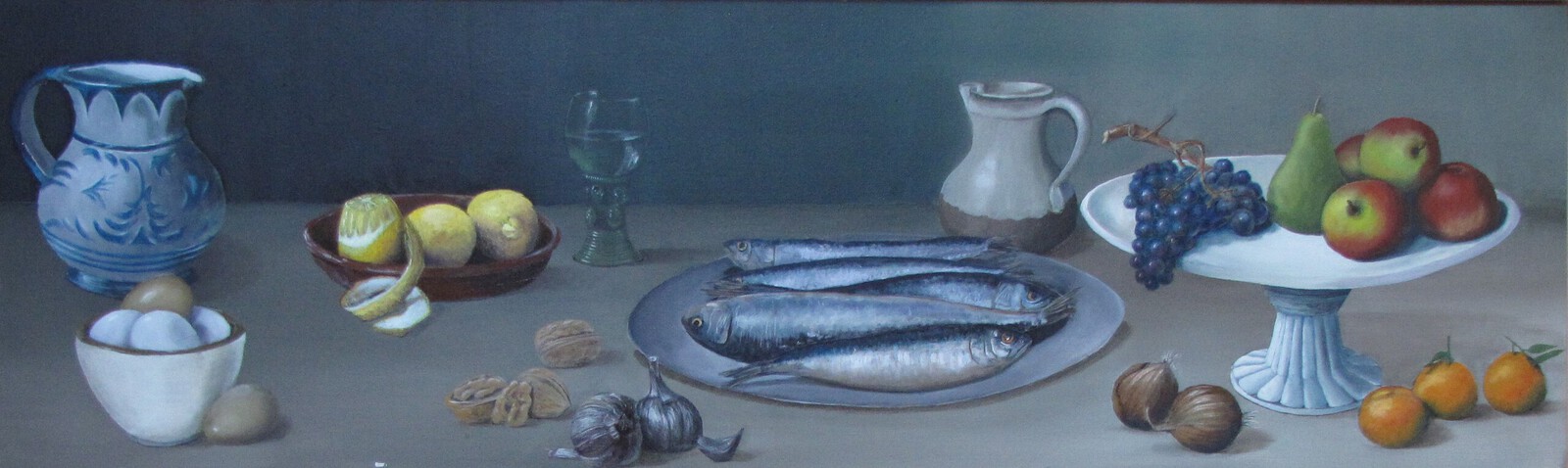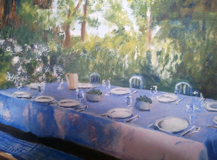 Viooltjes in Blauwe Vaas, acrylverfschilderij van bloemen