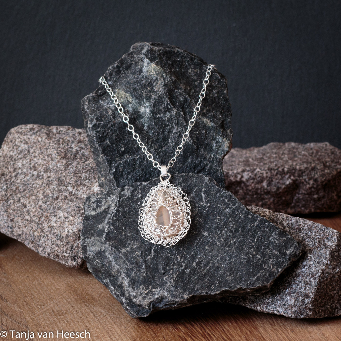 Zilveren oorhangers met rond ornament van gehaakt dun zilverdraad — €60,00
