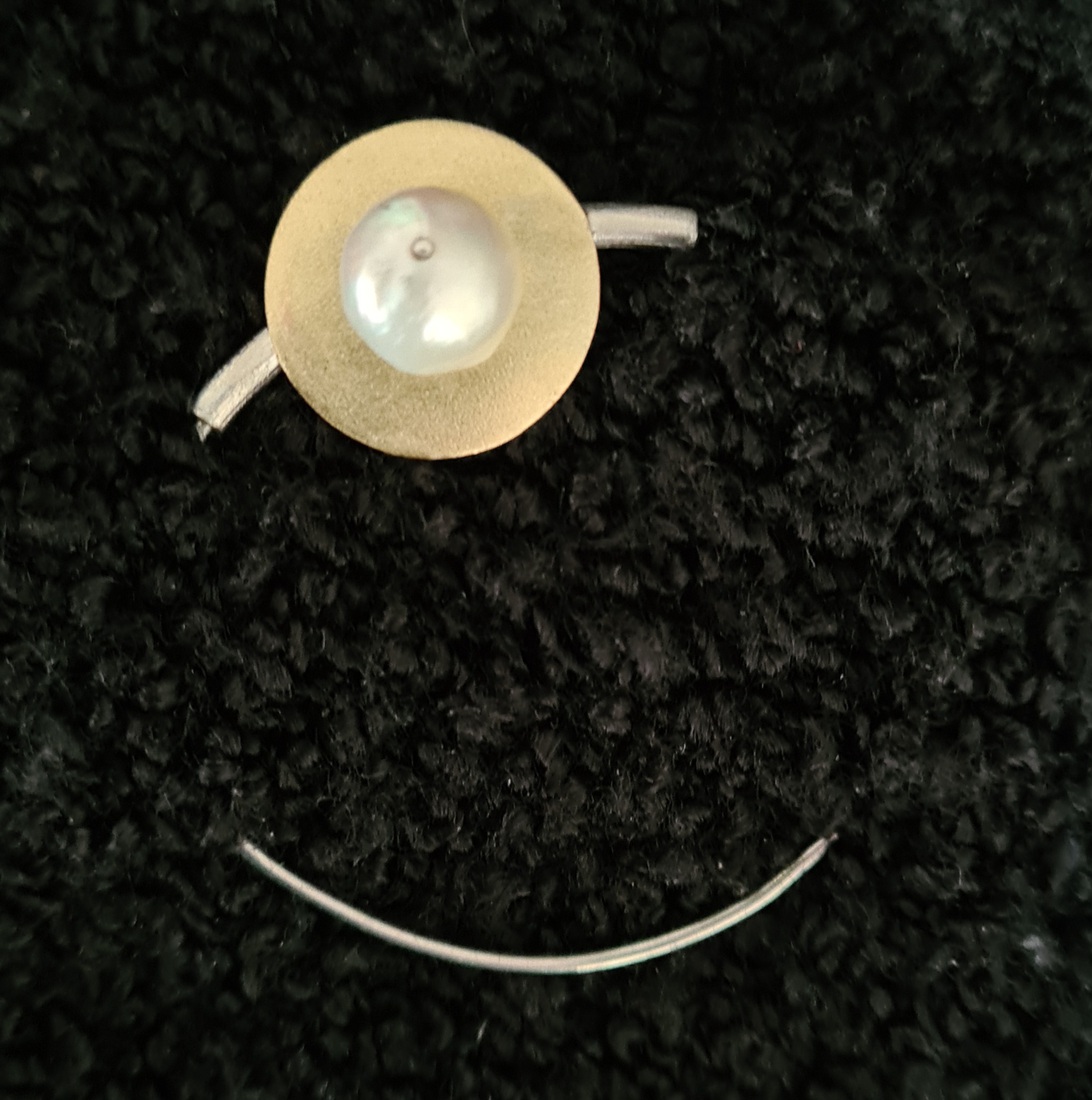 broche met messing plaatje met parel en zilveren buis