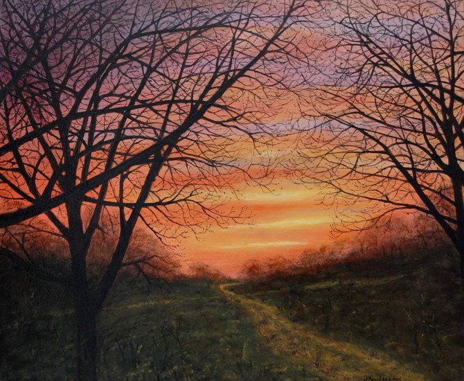 Een serene tropische zonsondergang. Techniek: Olieverf. Afmeting: 50cm x 50cm — €100,00