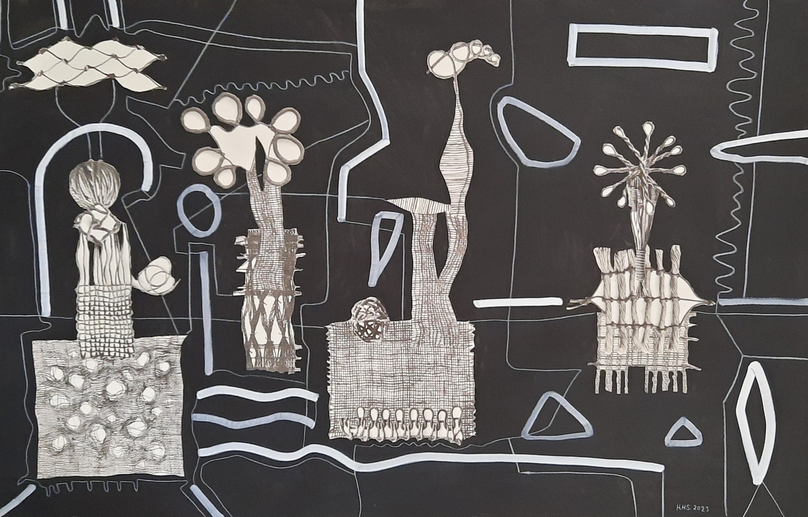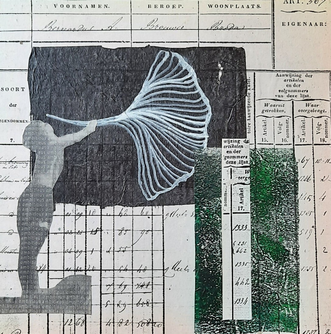 "Tovernarij" collage met lijntekening op papier.h50cmxb42cm. 2023