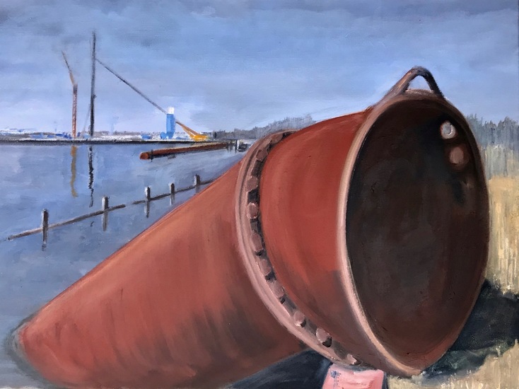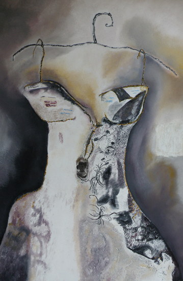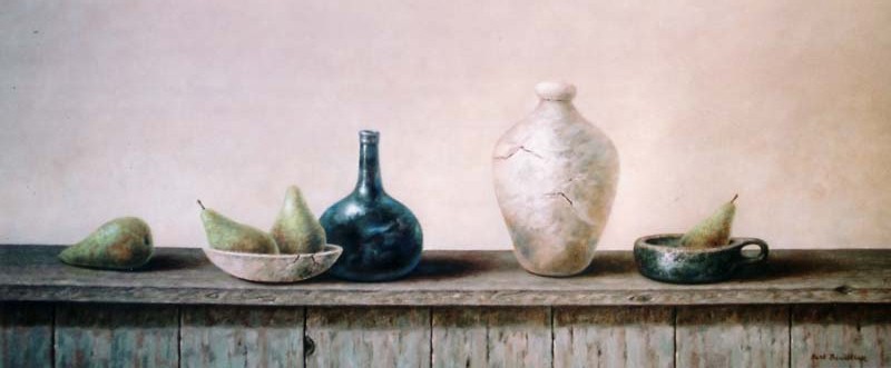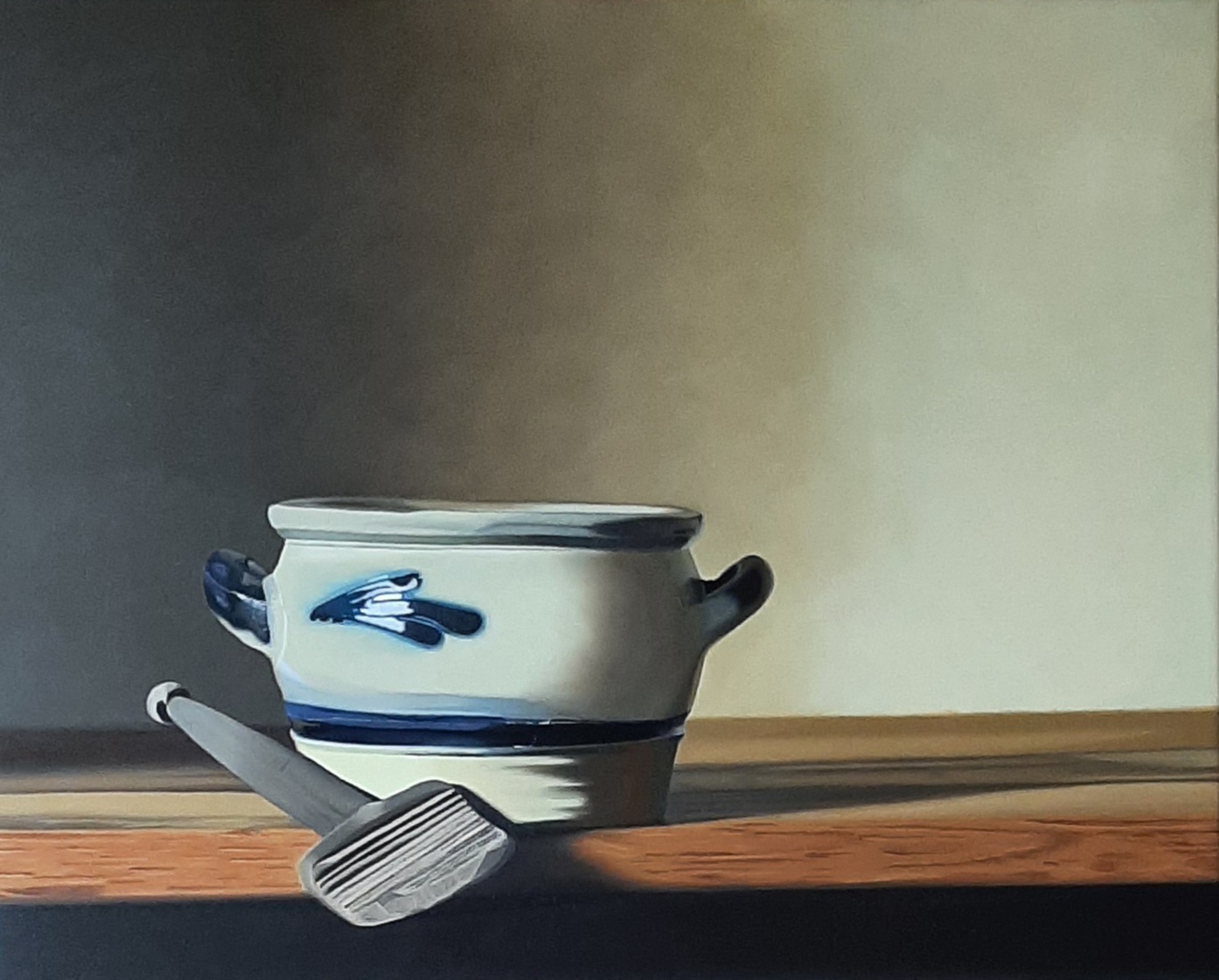 Keulse pot met oude houten boterlepel. - Steinzeug, Topf mit altem hölzernen Butterlöffel.