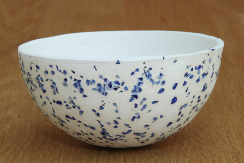 Schaal met blauwe glaskorrels en blauw gesmolten glas