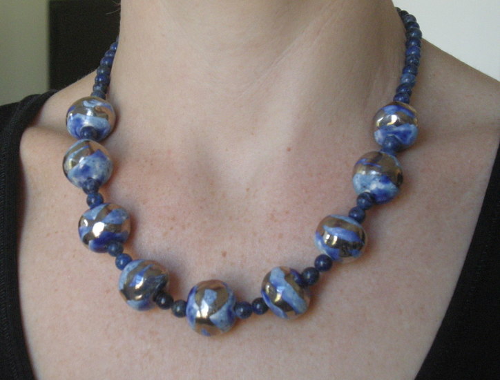 blauwe kralen ketting met platina luster