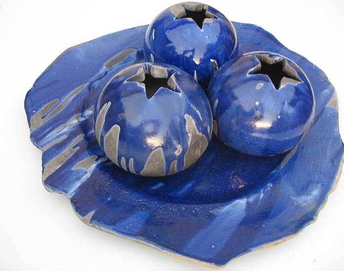 grote blauwe schaal met 3 bollen