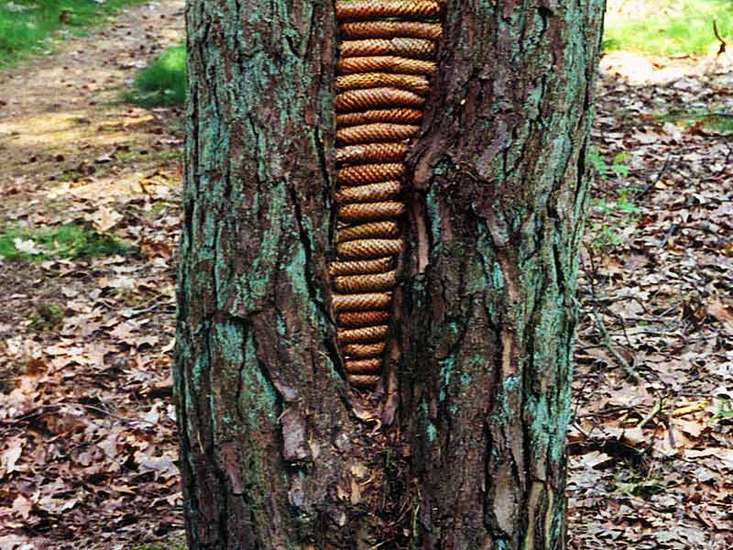 Dennenappels tussen 2 boomstammen
