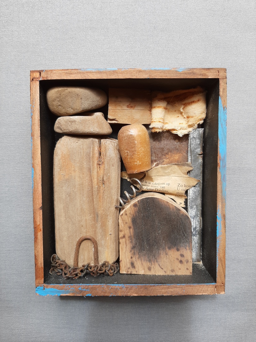 mixed media in spiegelkastje in lijst