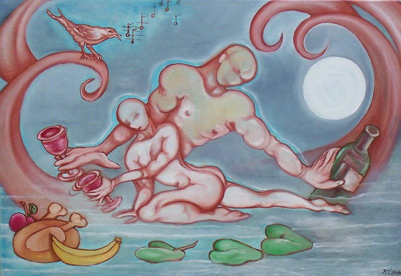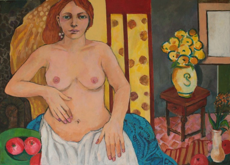 Halfnaakt met rechts gele bloemen.