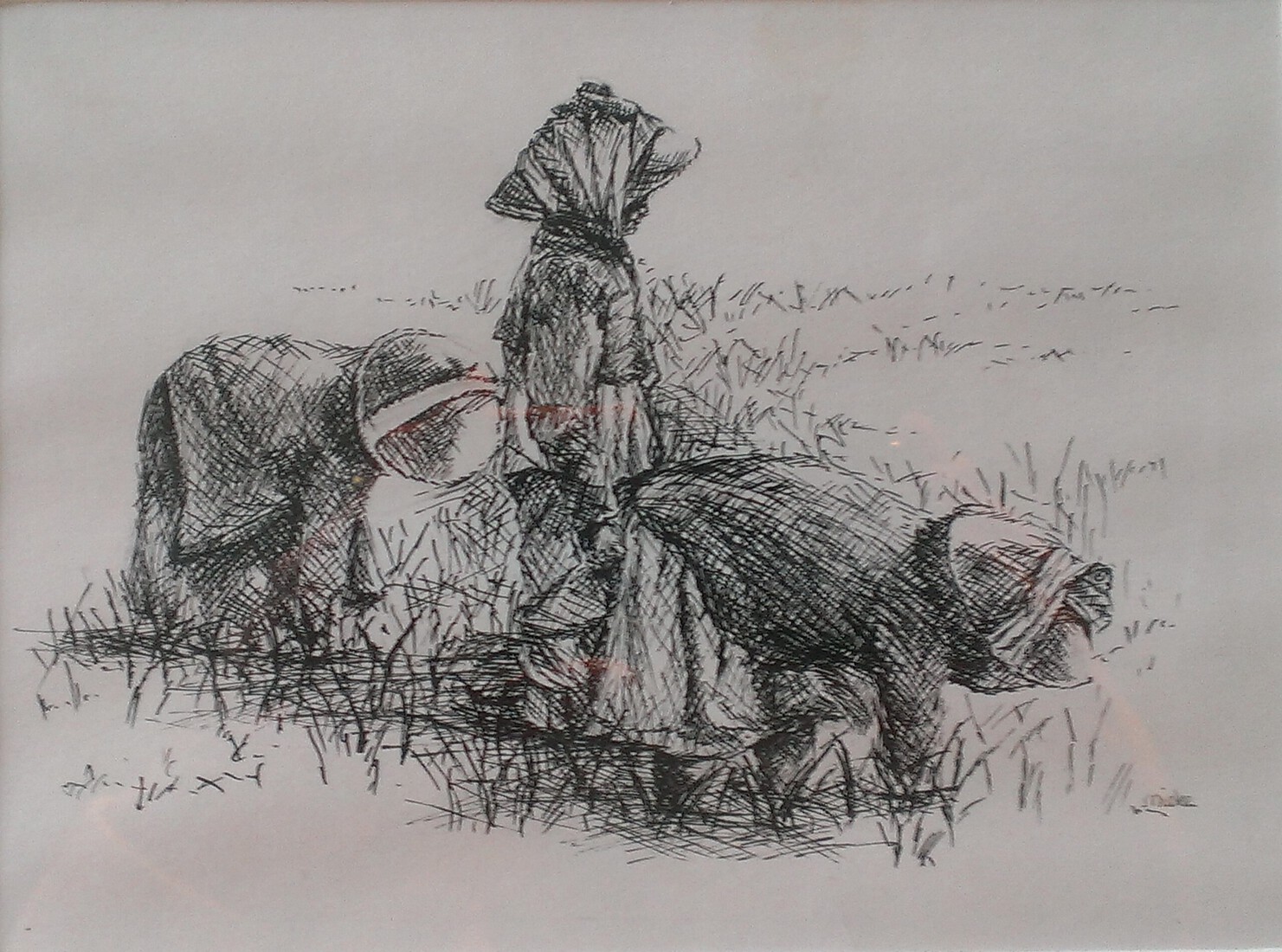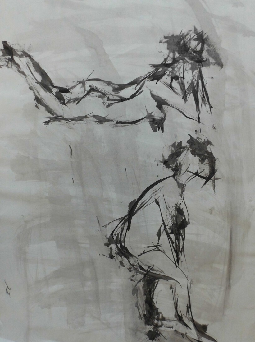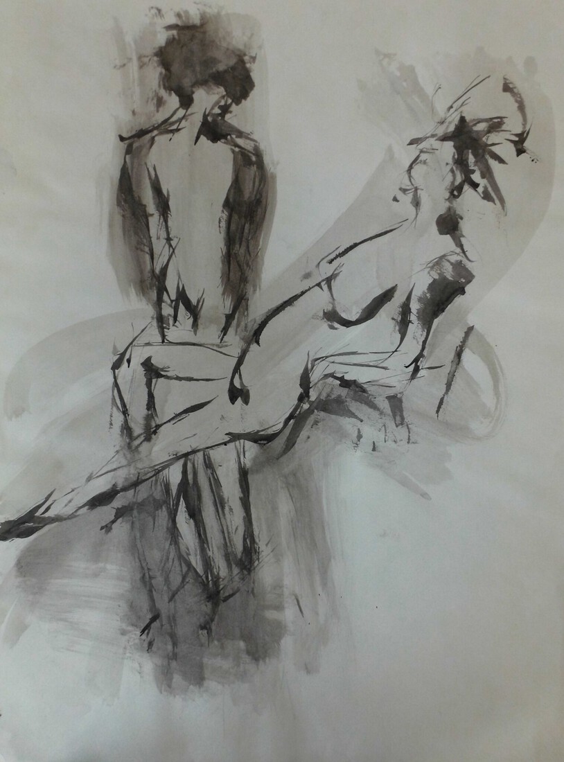 Naar model getekend met saté stokje in gewassen inkt.