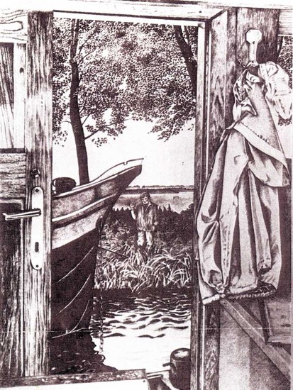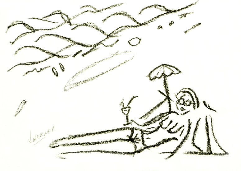 VROUW MET PARASOL - zwart wit strand tekening, te koop — €150,00