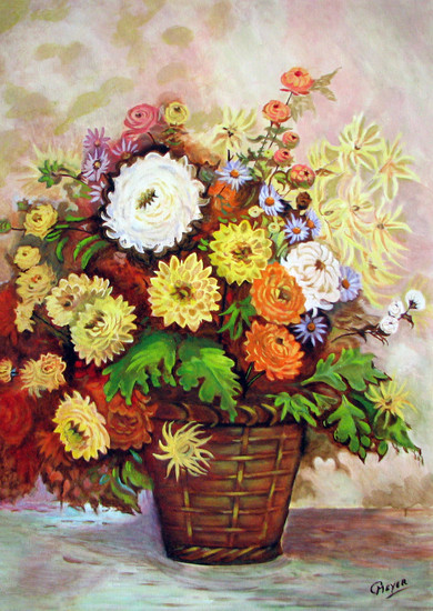 Gemengd bloemstuk in rieten mand