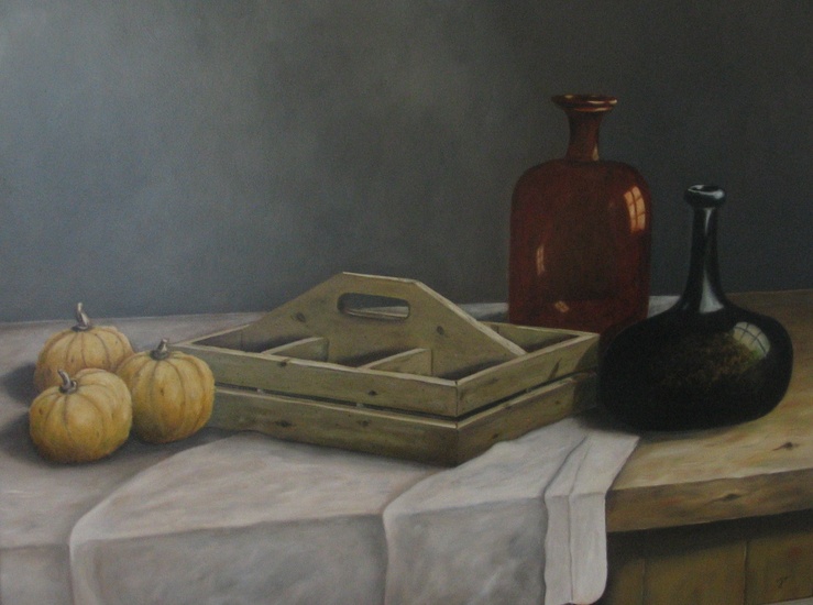 096. Mandarijnen, kom en oude fles.