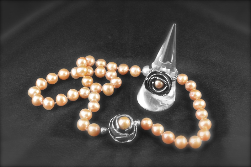 Zilveren ring met roze zoetwaterparel+parelcollier