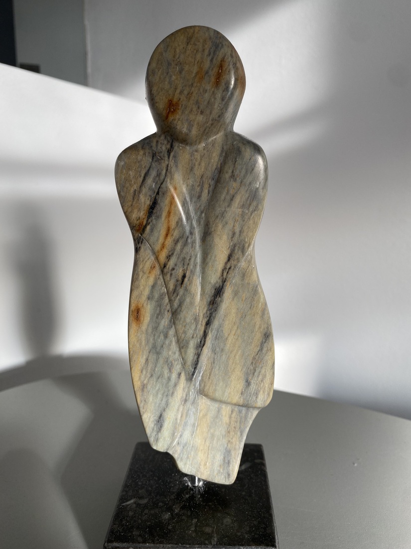 Keramiek beeldje van donkere relaxte slanke dame opzij leunend (rechts)