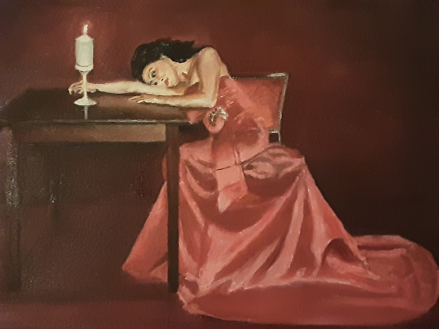 rustende vrouw in rode jurk