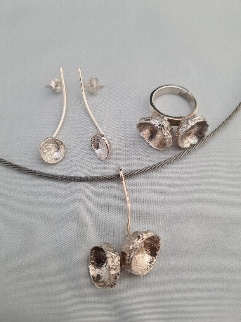 zilveren hanger met 2 gegoten eikeldopjes, ook oorhangers en ring met eikeldopjes