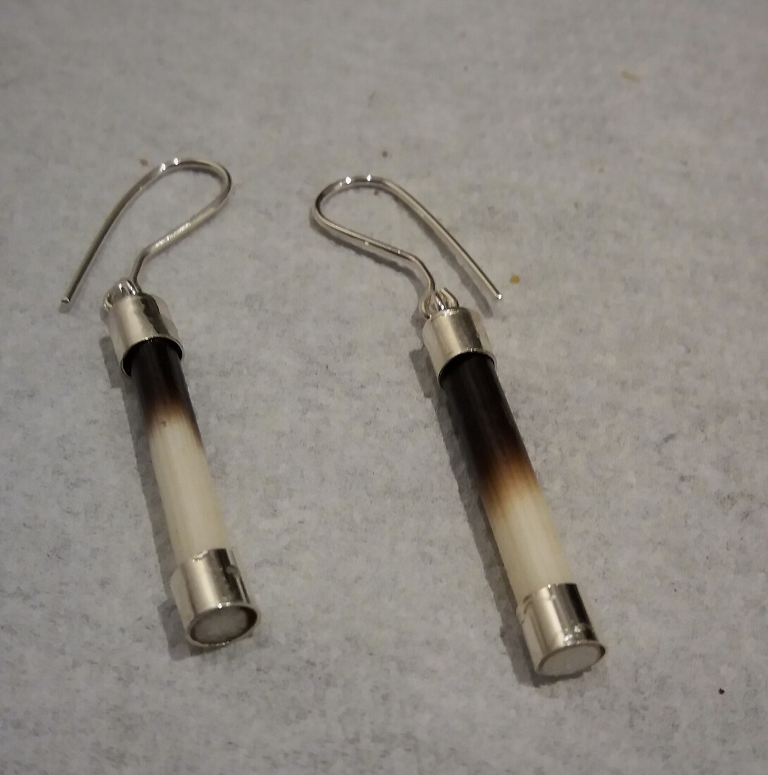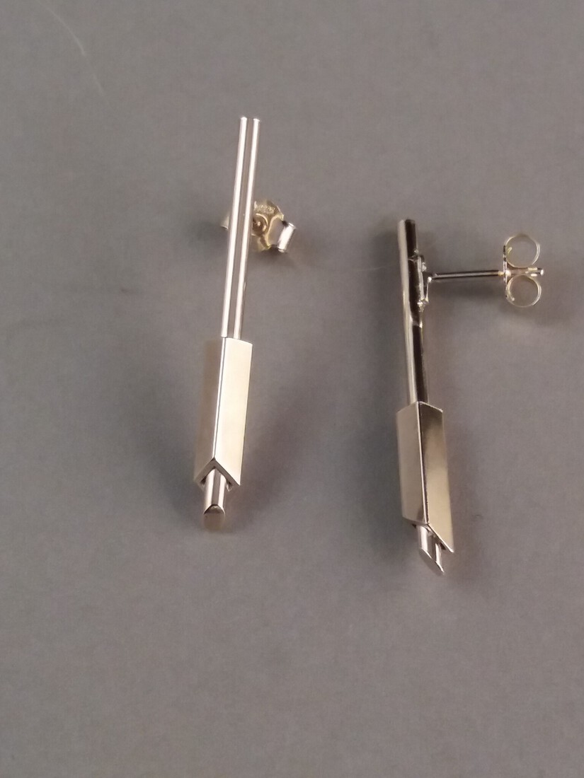 zilveren oorhangers met rond staafje en daarover heen vierkant buisje
