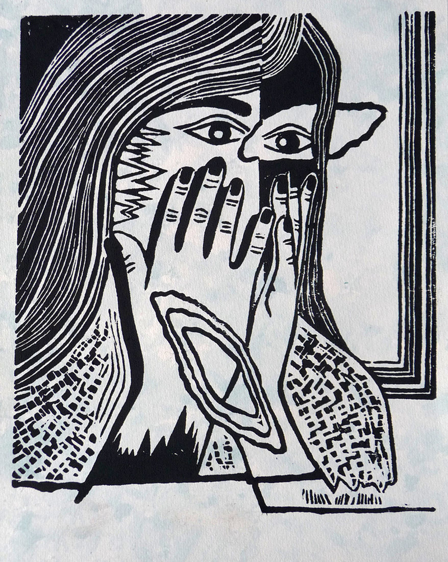 Ki teken 10 - linoleumsnede en Japanse stempels op gedecoreerde print, bewerkt met metallic poeders - handafdruk — €100,00