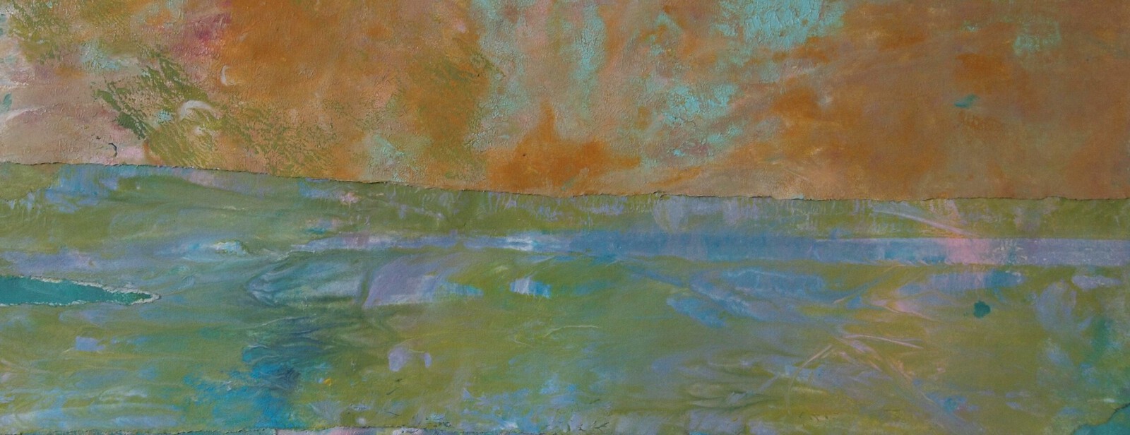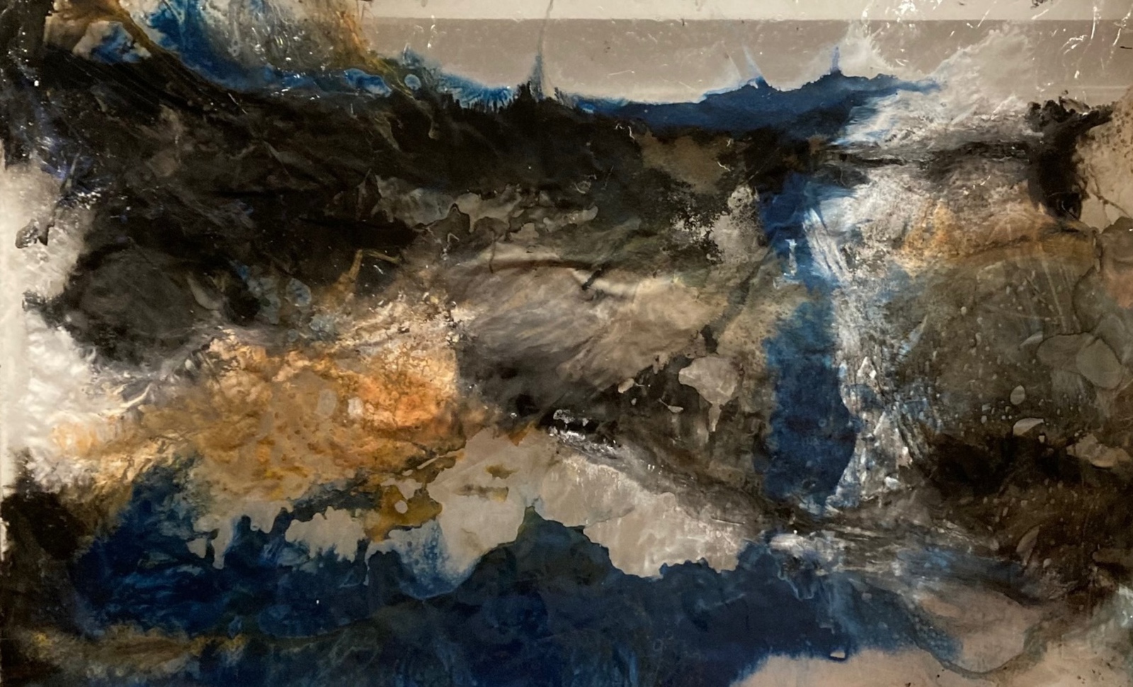 Abstract landschap in epoxy met goud, glas en blauw groen — €500,00
