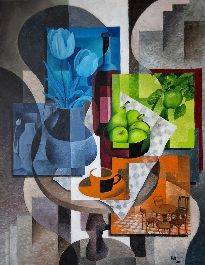 Stilleven met fles, vaas, fruit en koffiekopje — €850,00