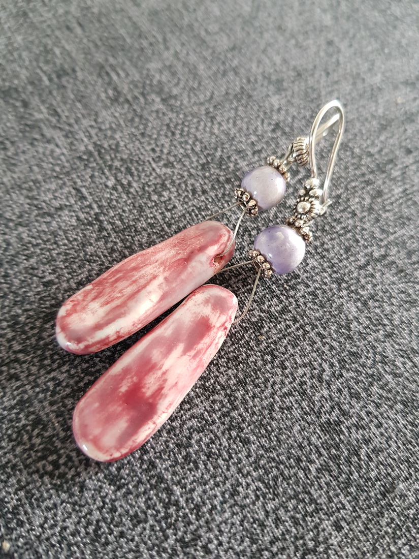Keramiek oorbellen in oud-roze en paars, Zilver925 oorbellen met kleine Zeeuwse knoop — €26,00