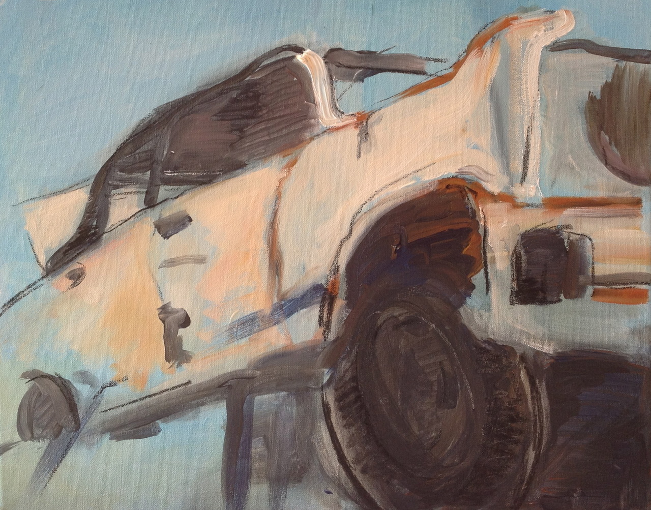 Auto Auto's Sloop Oud Wrak Wit Blauw Geel Oker Oranje Rood Paars Bruin Zwart Grijs Wagen Wagens Wrakken Realistisch Acryl Acrylverf Houtskool